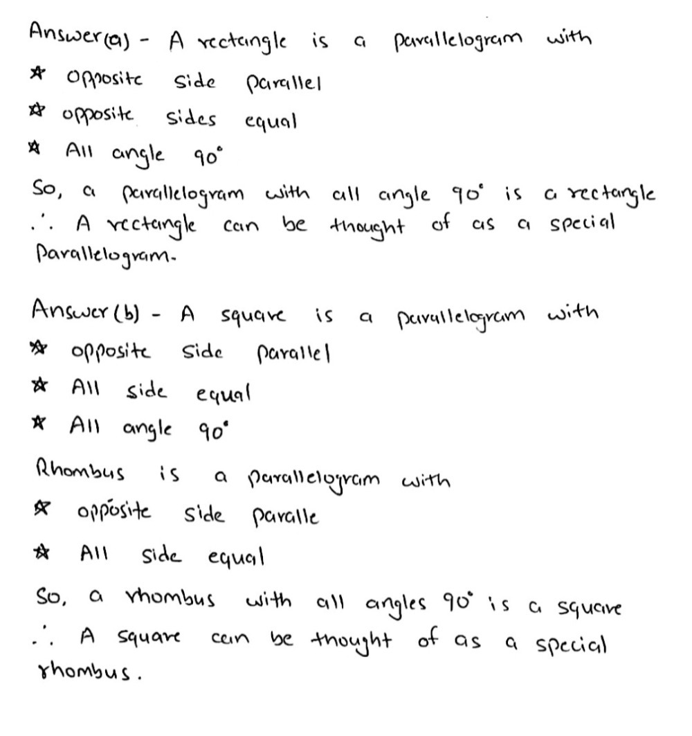 Give reasons for the following : (a) because its all angles are right angle and opposite sides are equal. Therefore square is a special rectangle.