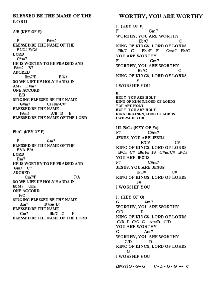 E a so we lift up ho ? Bbm f#m b7 he is worthy to be praised and adored; (d) blessed be the (em) name of the (d) lord he is worthy to be praised and (a) adored so we (d) lift up holy hands in one (g) accord singing (d) blessed be the name blessed be the name (g) blessed be the (a) name of the (d) lord.